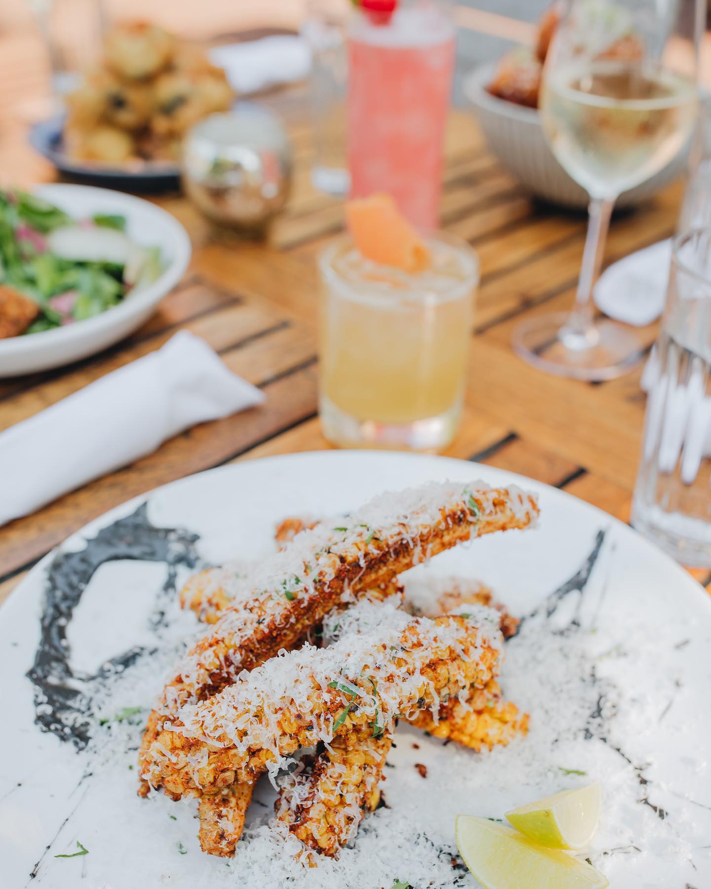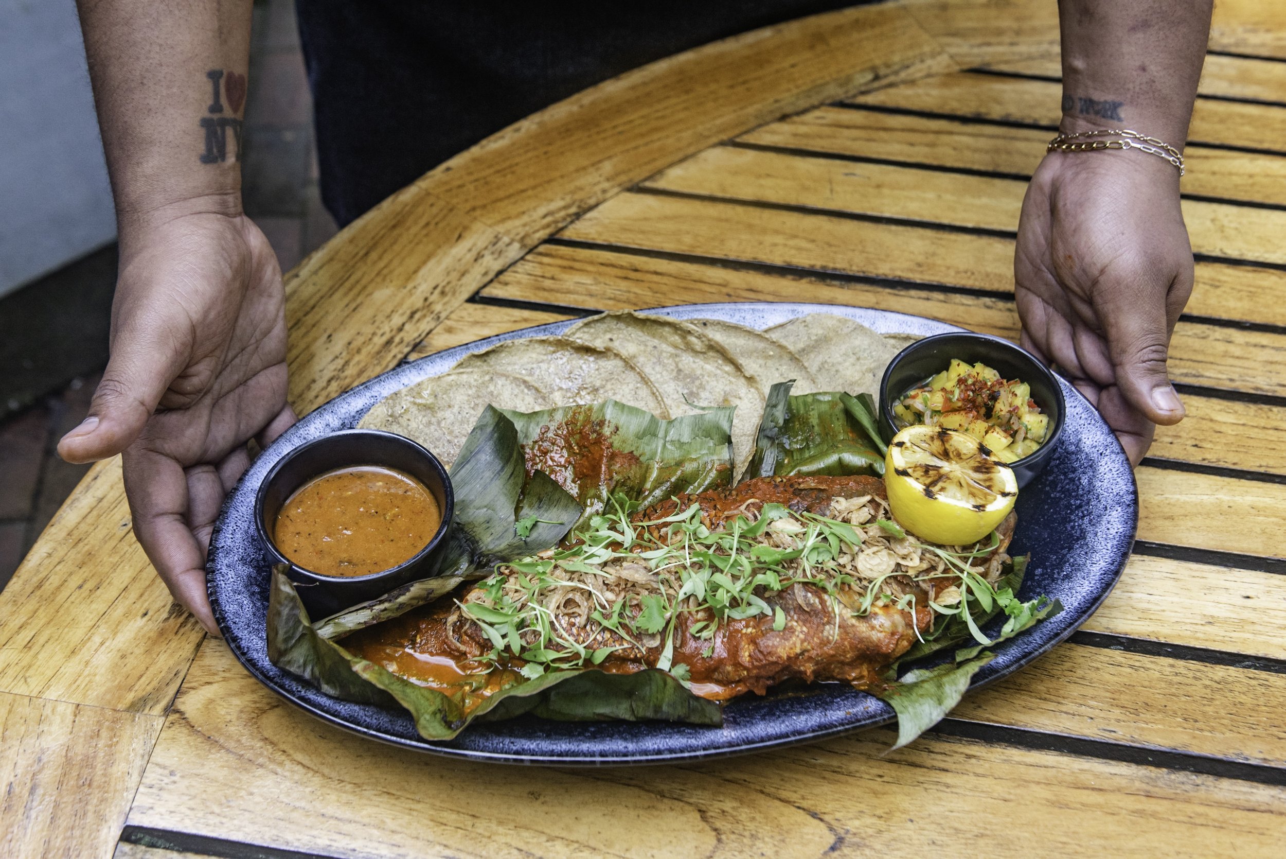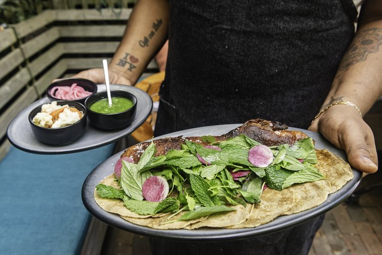 • Duck Carnitas: A flavorful dish perfect for sharing, showcasing tender duck with a delightful blend of spices. Duck Carnitas, Pickled Red Onion, Pickled Vegetables, Raw Tomatillo Salsa, Watermelon Radish, Fresh Herbs, Corn Tortillas