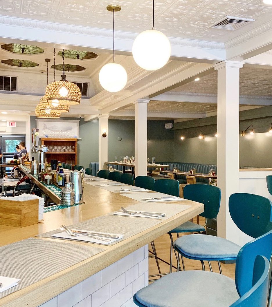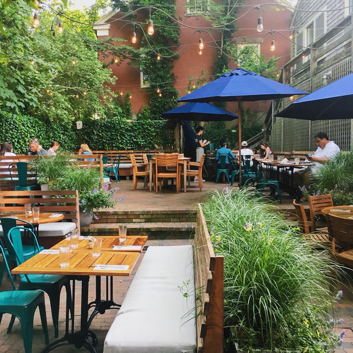 The restaurant boasts a stylish interior with modern décor, while the outdoor patio, adorned with twinkling lights and comfortable seating, offers a charming al fresco dining experience.