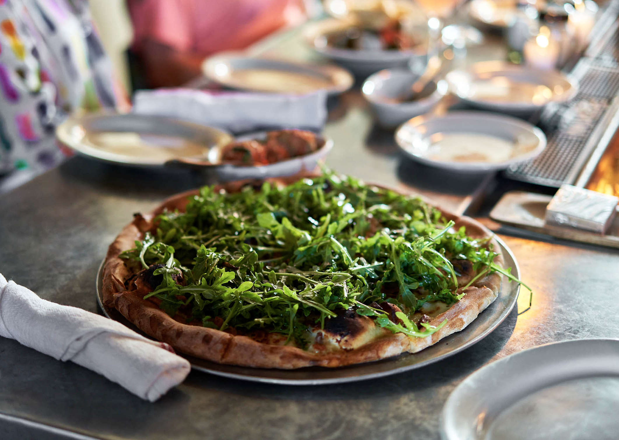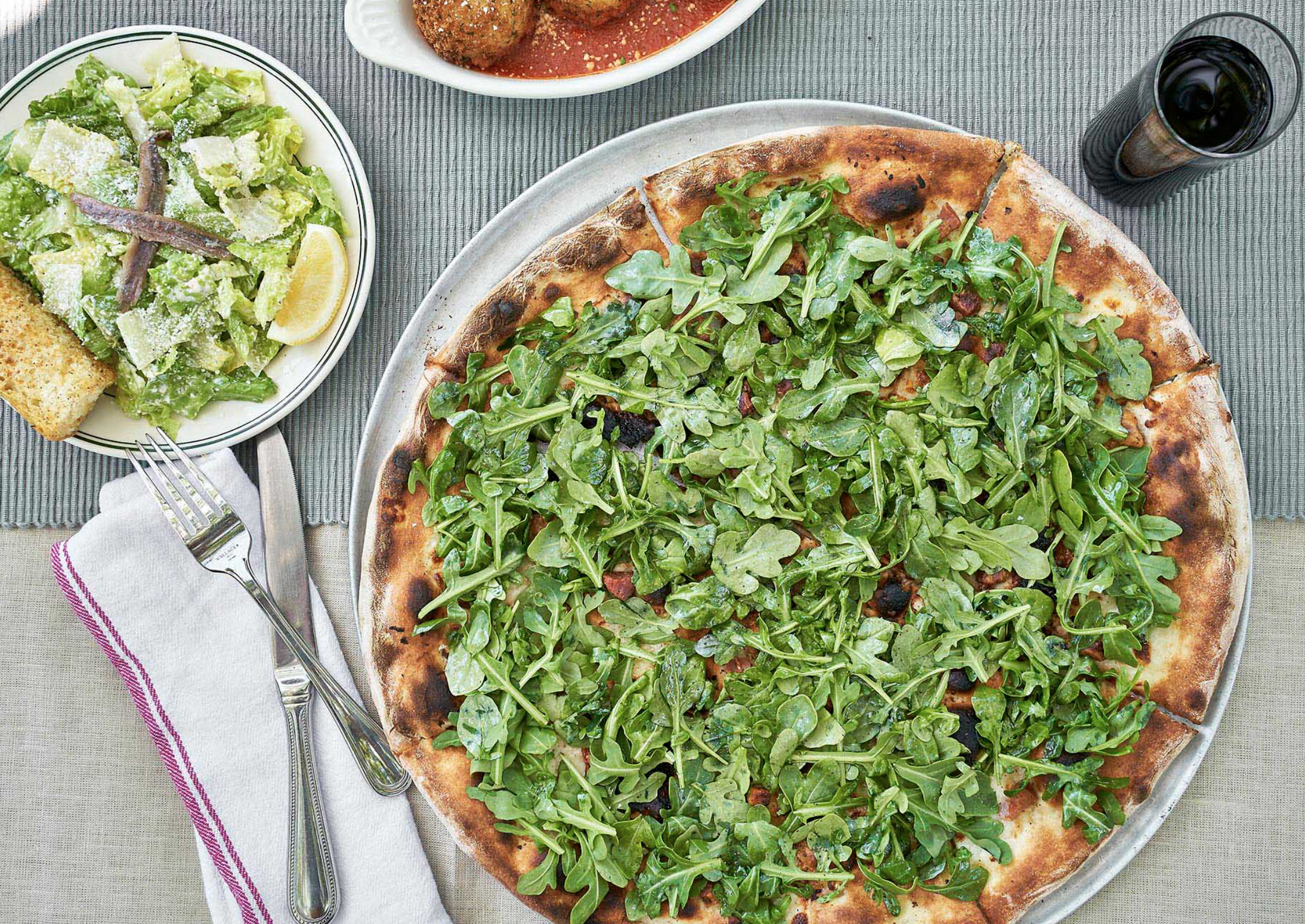 • Rustica Pizza: Arugula, stracchino cheese, pancetta, and garlic.