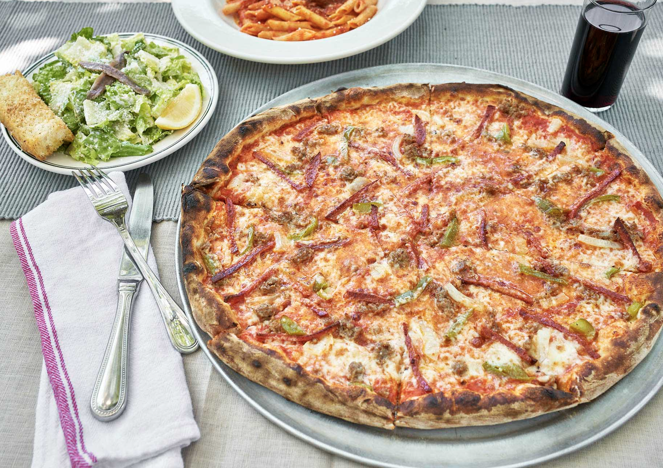 • Great Italian Pizza: San Marzano tomato sauce, mozzarella, Esposito’s sausage, pepperoni, green pepper, and onion.