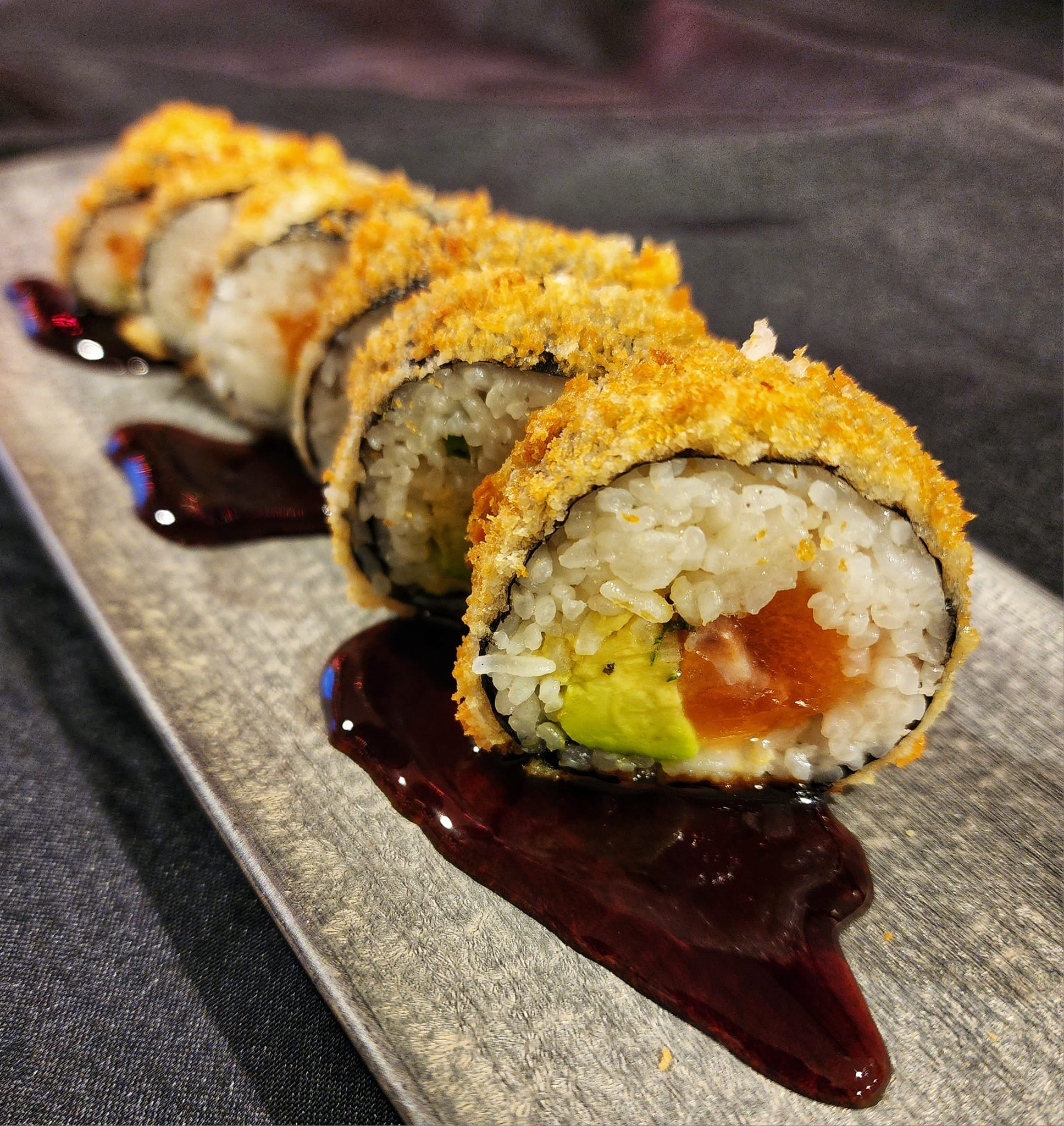 • Bonsai Roll: A creative roll featuring tempura shrimp, cucumber, and spicy mayo, finished with eel sauce.