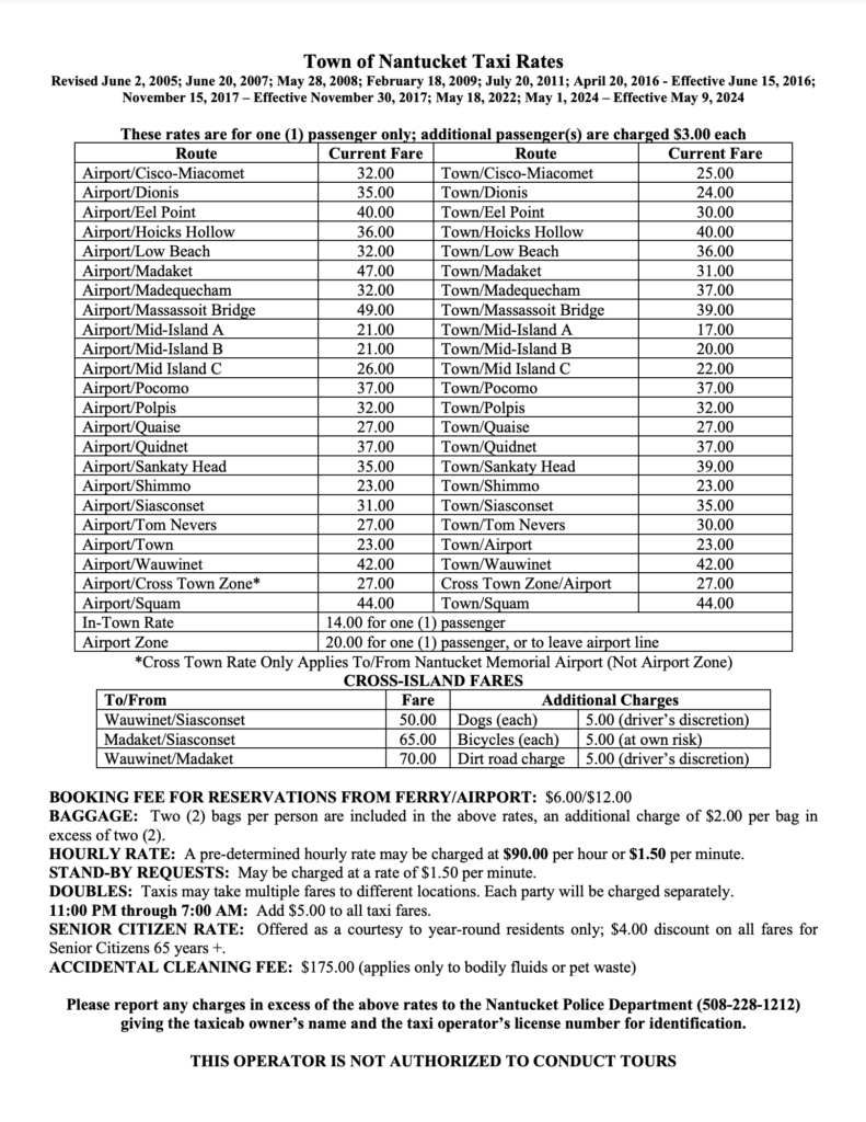 Taxi fares on Nantucket are typically calculated based on distance and route. While rates are generally consistent across companies, it’s always a good idea to confirm pricing before starting your trip. Most taxis accept cash, and some may also accept credit cards or digital payments.